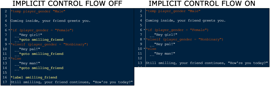 Implicit control flow is an optional modification to the way ChoiceScript behaves. It changes ChoiceScript's requirements by removing the need for *finish, *goto, *goto_scene, or *ending at the end of *choice, *elseif, and *else.