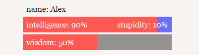 But let's say you wanted to write something at the end of a stat bar. For example, if you wanted to make an opposed pair out of intelligence and stupidity. Simply change the percent line to opposed_pair and add another line, indented one more level, and the text intended to be displayed opposite the variable. So something like this: