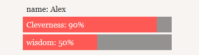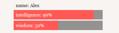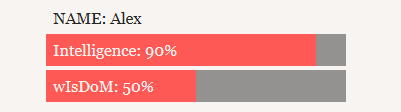 Let's say you have three variables: the "name" string variable containing the name of the player-character; the "intelligence" numeric variable containing a number from 0 to 100; and the "wisdom" numeric variable, also a value between 0 and 100. This is how they might be used within a *stat_chart for display purposes: